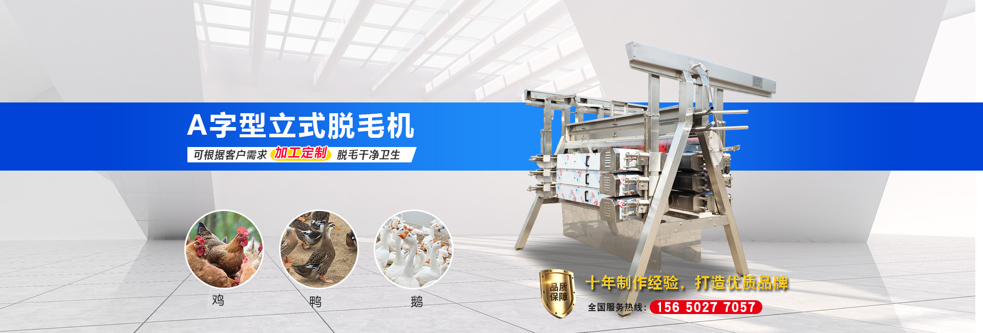 公司長期與國內外屠宰加工企業合作,走引進——消化——創新和自主研發相結合的道路,在國內外同類產品的基礎上,不斷更新和改造。公司主要設備有:A字型立式脫毛機、臥式脫毛機、強力噴淋機、松毛機、浸燙池、螺旋預冷機、禽籠清洗機、電暈機、兔扯皮機、兔割前爪/后爪機、剝胗機、自動洗鉤機、螺旋燙爪機、雞爪脫皮機、分割輸送帶等屠宰用設備。其中,公司獨力發明生產設計的“電動調節脫毛機”及“自動控水控溫浸燙池”順利通過知識產權局的實質性審查。公司所生產的設備 可與國外同類產品配套使用,設備遠銷阿爾及利亞、澳大利亞等中東、非州等并建立了長期穩定的合作關系。